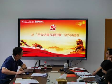 首先,由李文胜老师围绕云技术、云计算等相关知识进行了分享和交流,随后李志敏主任传达了学校数字化改革推进工作会议的精神,并对下阶段数字化改革的各项任务进行分解。陈昱宁副主任对中心六月份工作进行回顾总结,并对七月份工作进行部署。最后,陈昱宁副主任做了主题为“从‘三大纪律八项注意’谈作风建设”的专题党课,从“三大纪律八项注意”的产生说起,提出了作风建设要做到四个“要”。一要严明各项纪律,二要树立良好工作作风,三要增强团结协作意识,四要保持清正廉洁;最后在会上传达了发生在我省违反高校教师职业行为十项准则的典型案例,希望党员干部和教职工以案为鉴、以案明纪,并要求支部党员不忘初心、牢记使命,为我校推进数字化改革工作做出更大贡献。