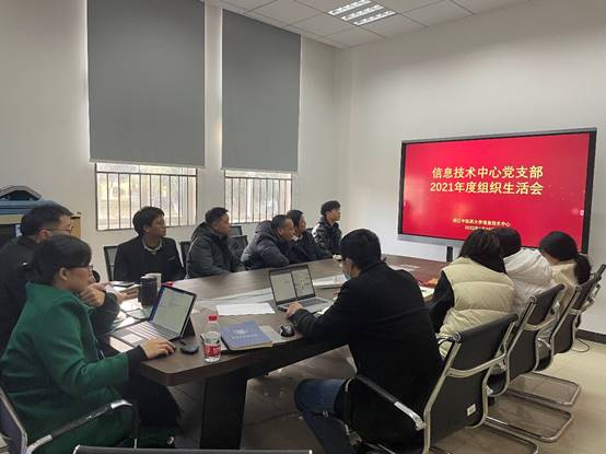 2022年1月19日下午,信息技术中心在1107会议室召开部门2021年度工作分析总结会暨组织生活会,会议由陈昱宁副主任主持,李志敏主任及中心全体成员参加会议。