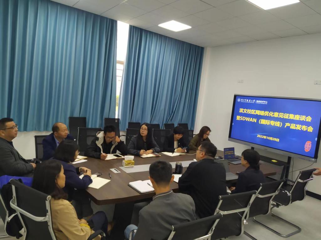 10月28日下午,信息技术中心在中心会议室召开滨文校区网络优化意见征集座谈会暨SD-WAN(国际专线)产品发布会,会议邀请了教务处、科研部、国际交流合作处、药学院、国际教育学院、教师教学发展中心、图书馆等部门的领导和老师参加,会议由信息技术中心副主任陈昱宁主持。