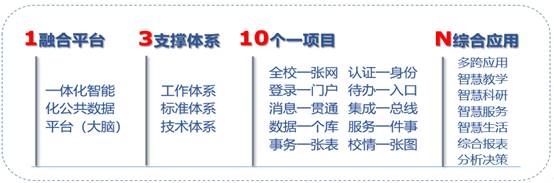 牢固树立“分析、综合、迭代”的逻辑思维,遵循“构建1个融合平台——完善3大支撑体系——实施十个一项目——创新N个综合应用”的路径(如下图所示),建设“校园大脑”。