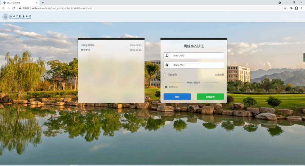 8、上网账号说明:在校师生通过统一身份认证的账号密码登陆,即学号/工号,初始密码为身份证后六位,校外人员可通过手机号码获取短信验证码输入后即可访问互联网。