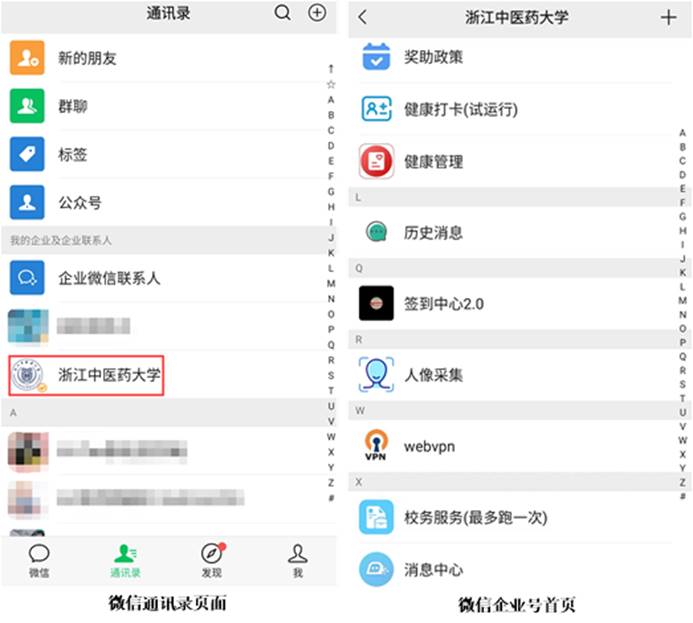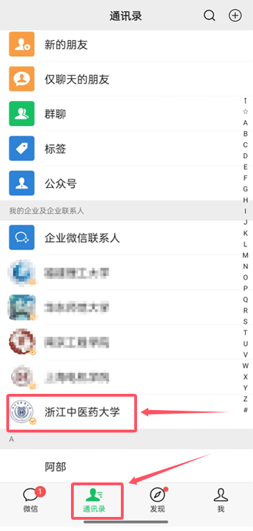 1、打开微信通讯录,在我的企业中找到“浙江中医药大学”,并点击进入微信企业号首页。
