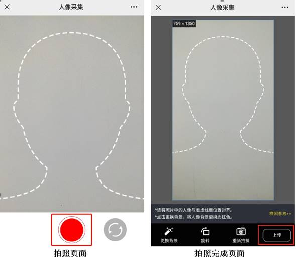 4、进入拍照页面,点击红色按钮进行拍照,拍照完成后可进行更换背景、旋转、重新拍摄等处理操作。照片拍摄处理完成后,点击“上传”按钮将所拍摄的照片上传。