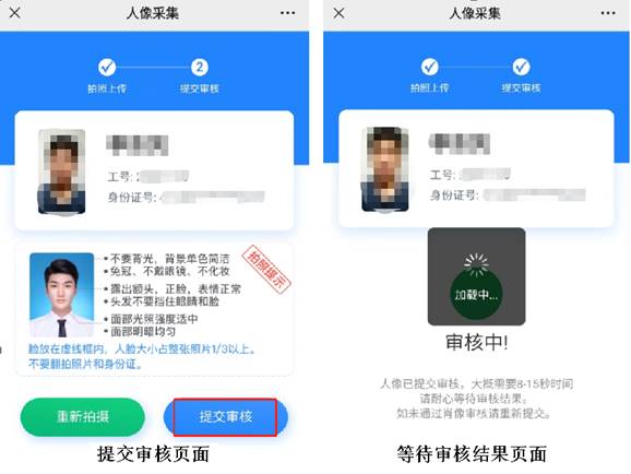 5、照片上传完成后,点击“提交审核”按钮,并耐心等待审核完成(约8-15秒时间);如对照片不满意,可在此页面点击“重新拍摄”按钮进行重拍。