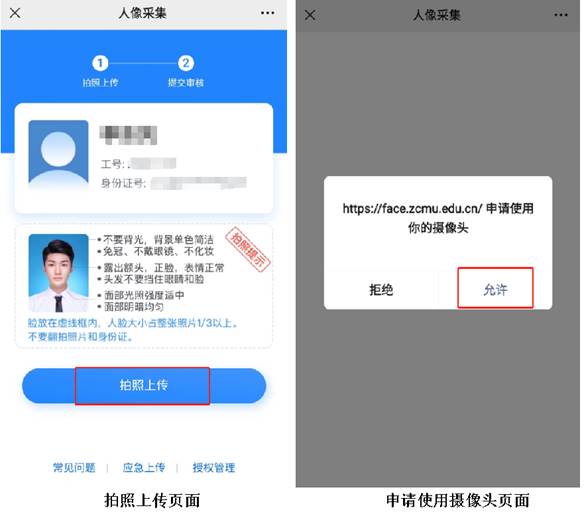 3、进入拍照上传页面,阅读拍照提示后,点击“拍照上传”按钮,并在弹出的申请使用摄像头页面中点击“允许”按钮。