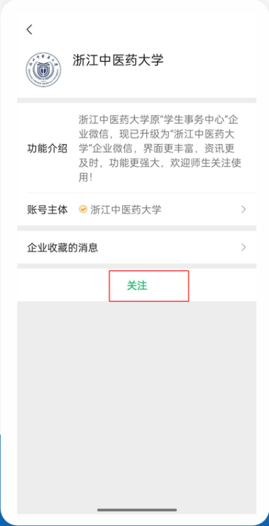 一、关注浙江中医药大学微信企业号的步骤如下: