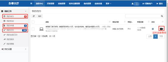 通过“个人中心”可以查看“我的申请”,“我的申请”包含了用户所有发起过的申请,用户通过查看某一个申请的事项,了解事项办理的每个环节的实时办理进度、办结情况等等。