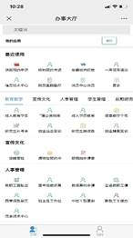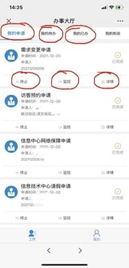 进入手机端校务服务办事大厅后,点击右下角“我的”,可查看“我的申请”、“我的待办”、“我的已办”和“我的知会”,可以对发起的申请查看办理进度或者终止申请。