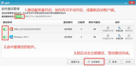 登录成功后,软件自动弹出商品激活管理窗口(Windows和Office默认各分配10次激活次数),点击左边的选项按钮,勾选需要激活的产品,然后点击“立即激活”。